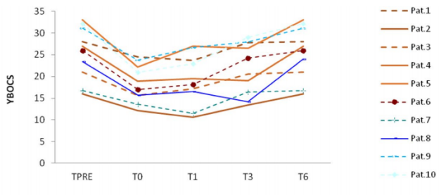 2019年的研究得出結(jié)論,經(jīng)過(guò)一個(gè)月的治療后,與基線水平相比,該研究參與者的強(qiáng)迫癥癥狀有了統(tǒng)計(jì)學(xué)意義上的顯著改善。我們發(fā)現(xiàn)所有患者的強(qiáng)迫癥癥狀在T1前都有所改善,其中4例在T3前有所改善。與其他參與者相比,這些患者表現(xiàn)出了更廣泛的額葉區(qū)相位同步化和額頂葉相干性的重塑。